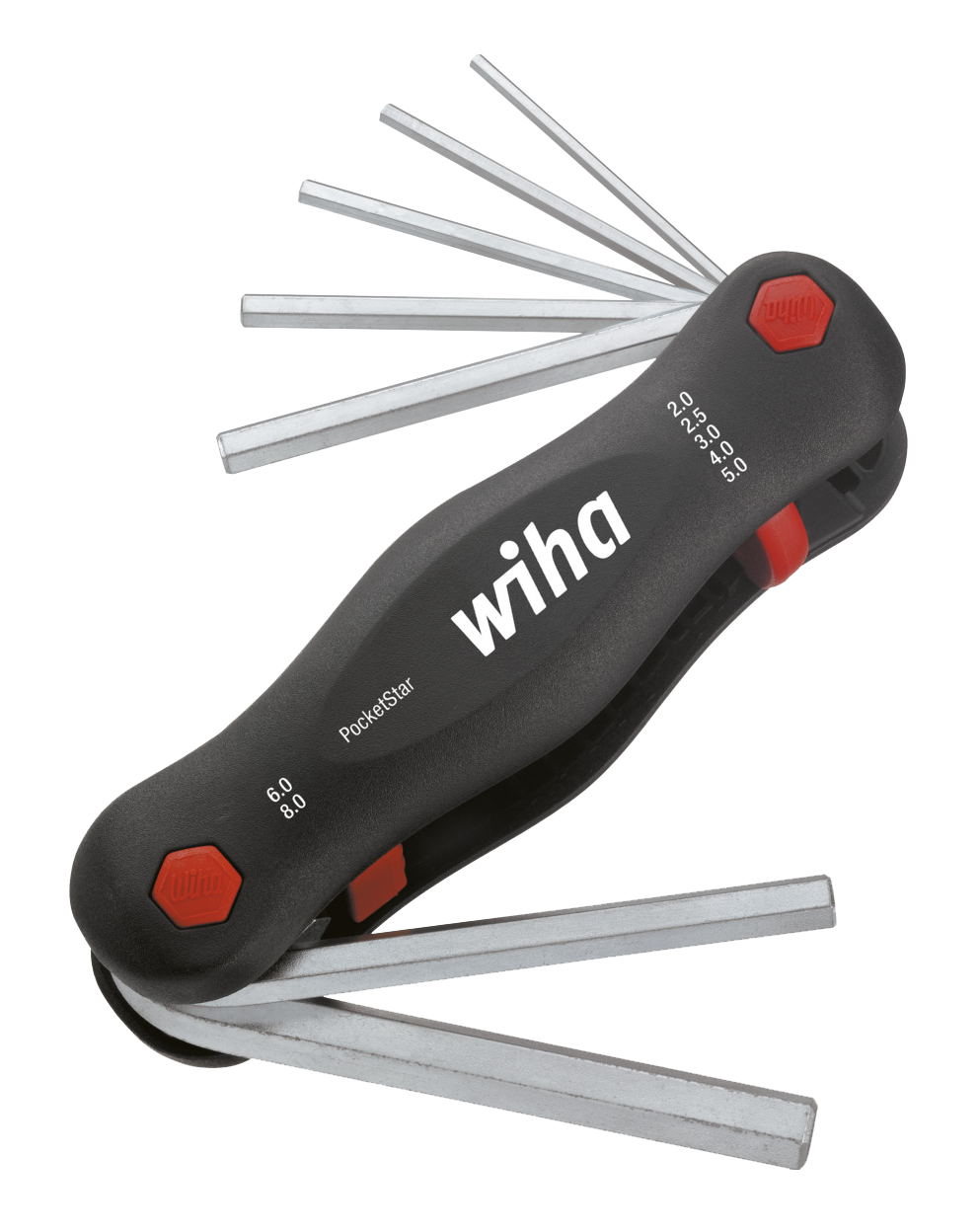 De negen stiftsleutels worden plaatsbesparend in een handzame uitklaphouder bewaard. Daardoor is de stiftsleutelset perfect geschikt voor mobiel gebruik en past hij in elke broekzak. Met de wipknop kan eenvoudig en gemakkelijk de gewenste sleutelmaat worden geselecteerd. Dankzij de variabel instelbare werkstanden is de PocketStar ideaal voor universeel gebruik: In de 180°-stand verandert het gereedschap in een schroevendraaier met normale handgreep. Wanneer de sleutel in de 270°-aanslag staat, wordt de uitklaphouder een gereedschap met praktische hefboom voor hoge momenten. In deze stand wordt omknikken en daarmee het bekneld raken van vingers voorkomen