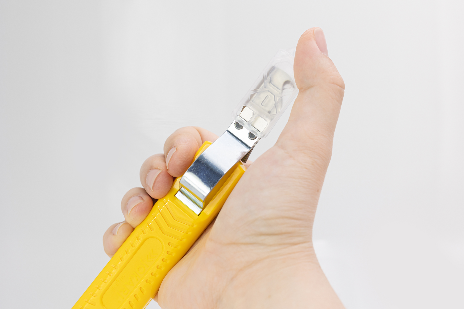 • De beugel is voorzien van een recht mes met veilige afschermkap voor diverse toepassingen.
