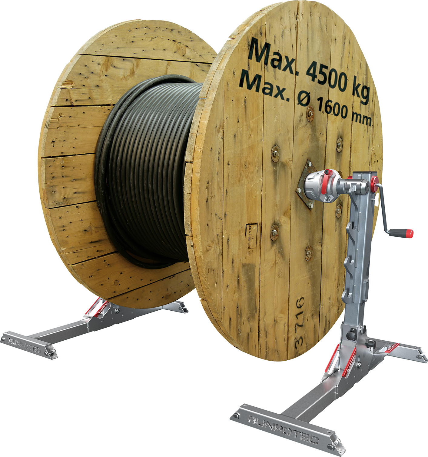 De RUNPO Lifter 4500 is een inklapbare kabeltrommellifter die trommels kan optillen tot een maximale diameter van 1600 mm en een maximumgewicht van 4.500 kg.