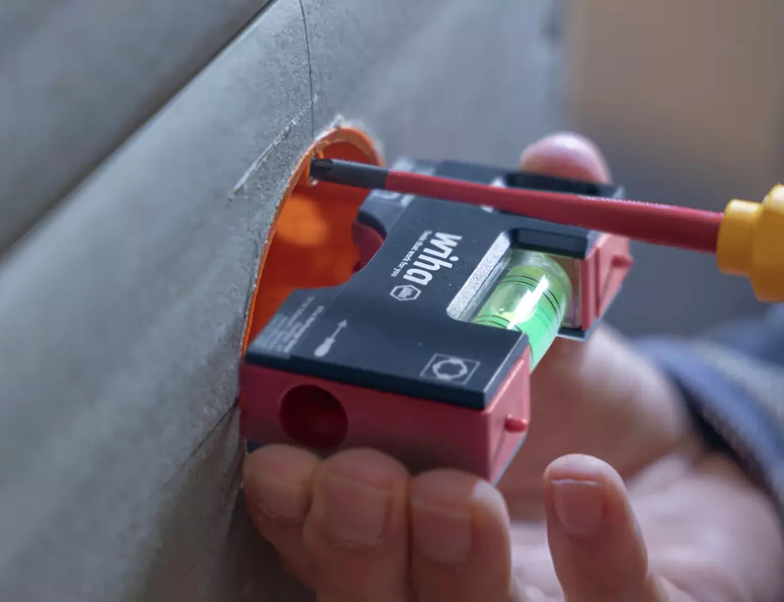 De Wiha Pocket mini-waterpas is een compacte en slimme tool voor het nauwkeurig monteren van wandcontactdozen. Je kunt er zowel horizontaal als verticaal perfect mee uitlijnen, en zelfs een lichte afschot van 2% instellen. Dankzij handige centreerpunten past hij precies op inbouwdozen, terwijl een kerf helpt bij hollewanddozen. Magneten zorgen ervoor dat hij stevig op metalen onderdelen blijft zitten.