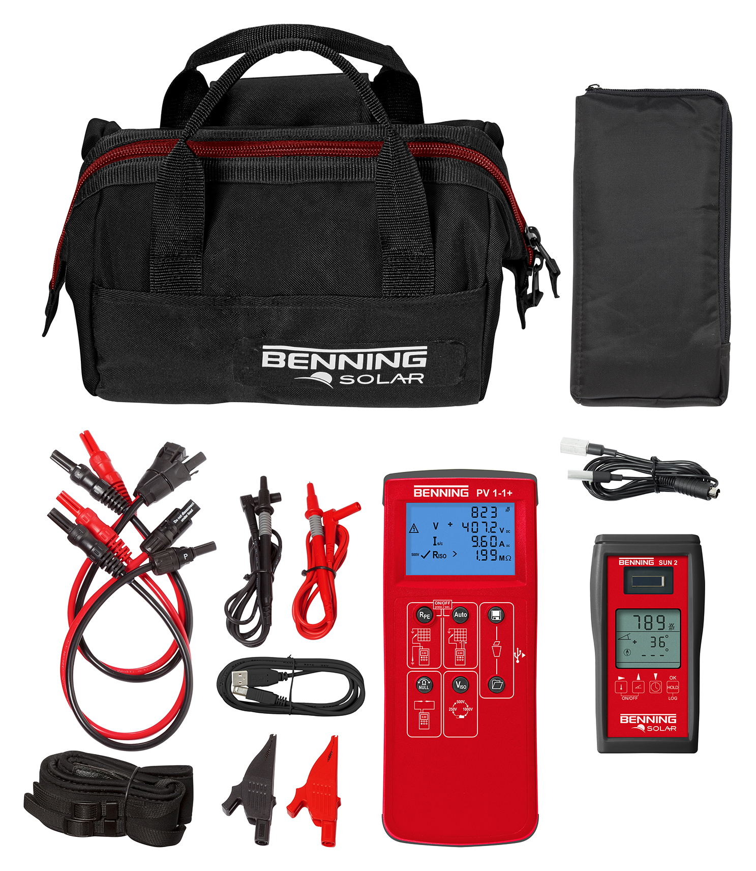 • Inclusief tas met draagriem, 4 mm veiligheidsmeetsnoeren, krokodillenklemmen, MC4-/Sunclix-veiligheidsmeetsnoeren, download/driver-software (CD), micro USB-kabel, batterijen en gebruiksaanwijzing