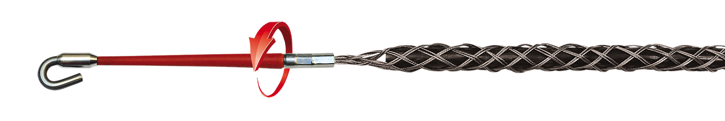 Uit RVS draad geweven trekkous met anti-torsie as die er voor zorgt dat de kabel en de trekveer ten opzichte van elkaar kunnen draaien