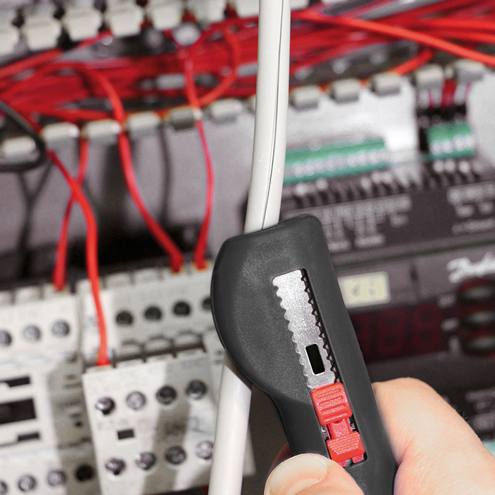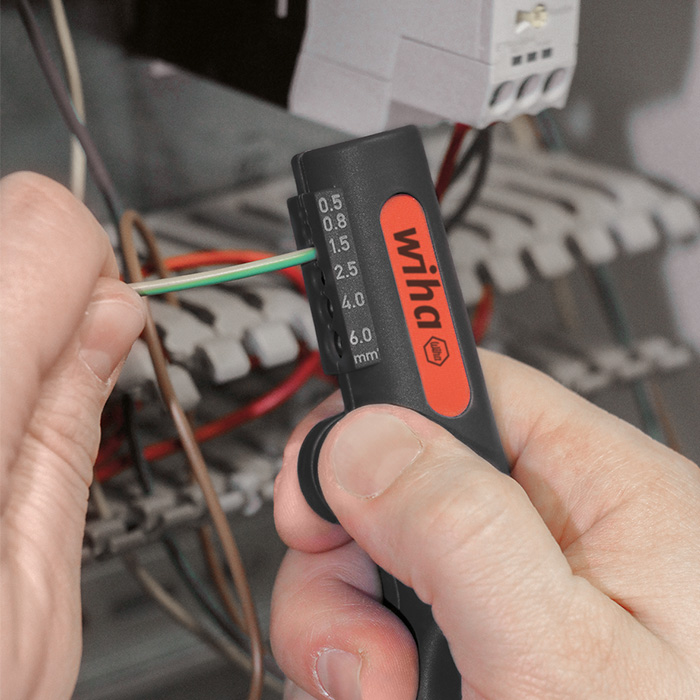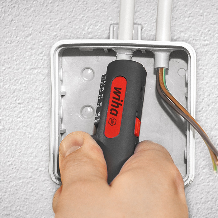 Toepassing: Vlak ontmantelen en strippen van ronde kabel en kabel voor vochtige ruimten met diameter 8 mm - 13 mm (bijv. NYM 3 x 1,5 mm² tot 5 x 2,5 mm²), ook op moeilijk toegankelijke plaatsen, bijv. in het plafond- en wandgebied, in aftak- en verdeeldozen, schakelkasten enz. Schoon strippen van flexibele en massieve geleiders in het bereik van 0,5 mm² - 6,0 mm²